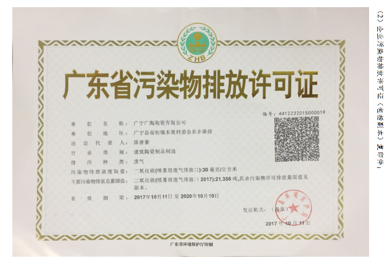 排污許可證(廣東。 | 附件鏈接:《廣寧廣陶陶瓷有限公司排污許可證》 | ||||||||